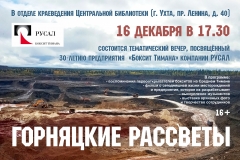 16 декабря в Центральной библиотеке г. Ухты состоится тематический вечер «Горняцкие рассветы», посвященный 30-летию предприятия «Боксит Тимана» компании РУСАЛ. Приглашаются все желающие!