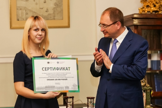 В Санкт-Петербургском университете наградили победителей и призеров конкурса студенческих проектов «Россия, устремленная в будущее», организованного Советом ректоров вузов Северо-Западного федерального округа при поддержке аппарата полномочного представителя президента РФ в СЗФО.