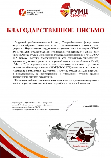 Ухтинский университет получил благодарственное письмо от ресурсного учебно-методического центра (РУМЦ) Северо-Западного федерального округа по обучению инвалидов и лиц с ограниченными возможностями здоровья Череповецкого государственного университета.