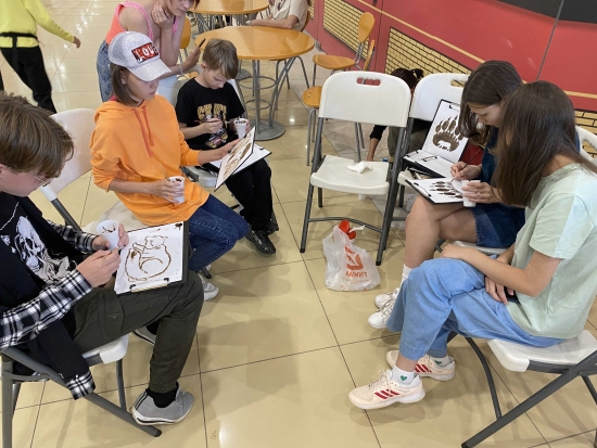 Рисование нефтью прошло гладко: каждый желающий получал в свое распоряжение стаканчик с «черным золотом», планшеты с бумагой, кисточки и творил в свое удовольствие. Неопытные художники пользовались готовыми шаблонами. Рисунки нефтью участники мастер-класса, в числе которых был и проректор Герман Леппке, оставили себе на память.