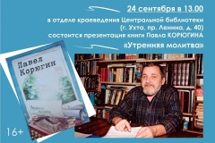 24 сентября в 13.00 в Центральной библиотеке г. Ухты (пр. Ленина, д.40) состоится презентация сборника произведений Павла Корюгина «Утренняя молитва».