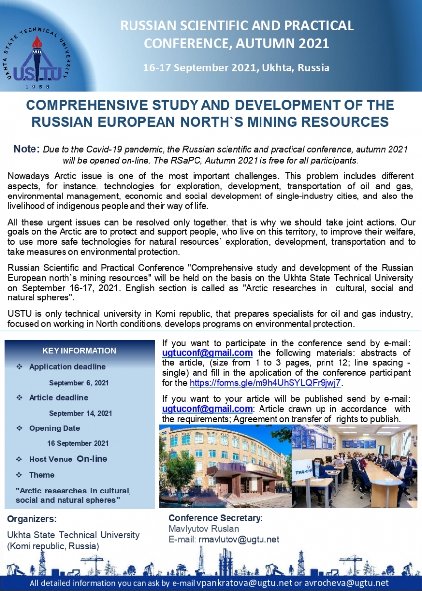 Приглашаем принять участие во Всероссийской научно-практической конференции «Комплексное изучение и освоение недр Европейского Севера России» которая пройдёт на базе Ухтинского государственного технического университета 16-17 сентября 2021 г.