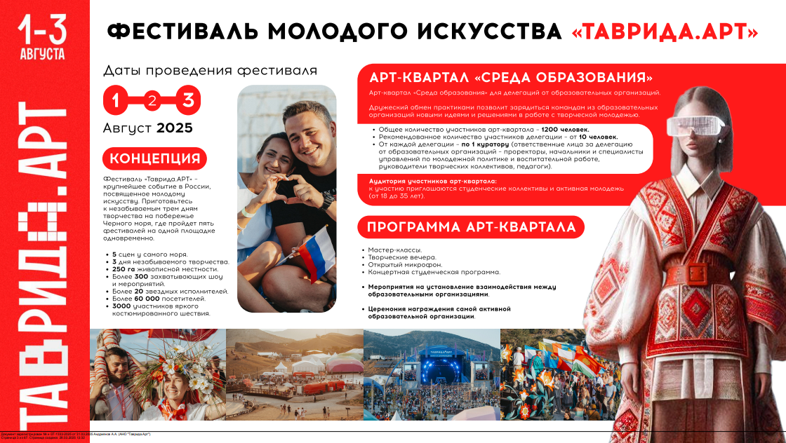 Автономная некоммерческая организация «Таврида.Арт» запускает фестиваль молодого искусства «Таврида.АРТ», который пройдет с 1 по 3 августа 2025 года в Арт-кластере «Таврида» (Судак, Республика Крым).