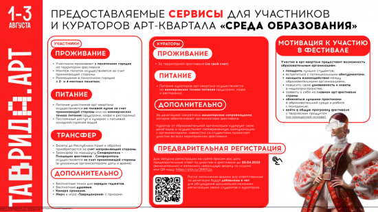 Особое внимание уделено образовательным организациям: в рамках фестиваля создается арт-квартал «Среда образования». Здесь студенты и преподаватели смогут поучаствовать в мастер-классах, открытых микрофонах, концертах и встречах с коллегами из других учебных заведений. Программа включает также церемонию награждения наиболее активных участников.