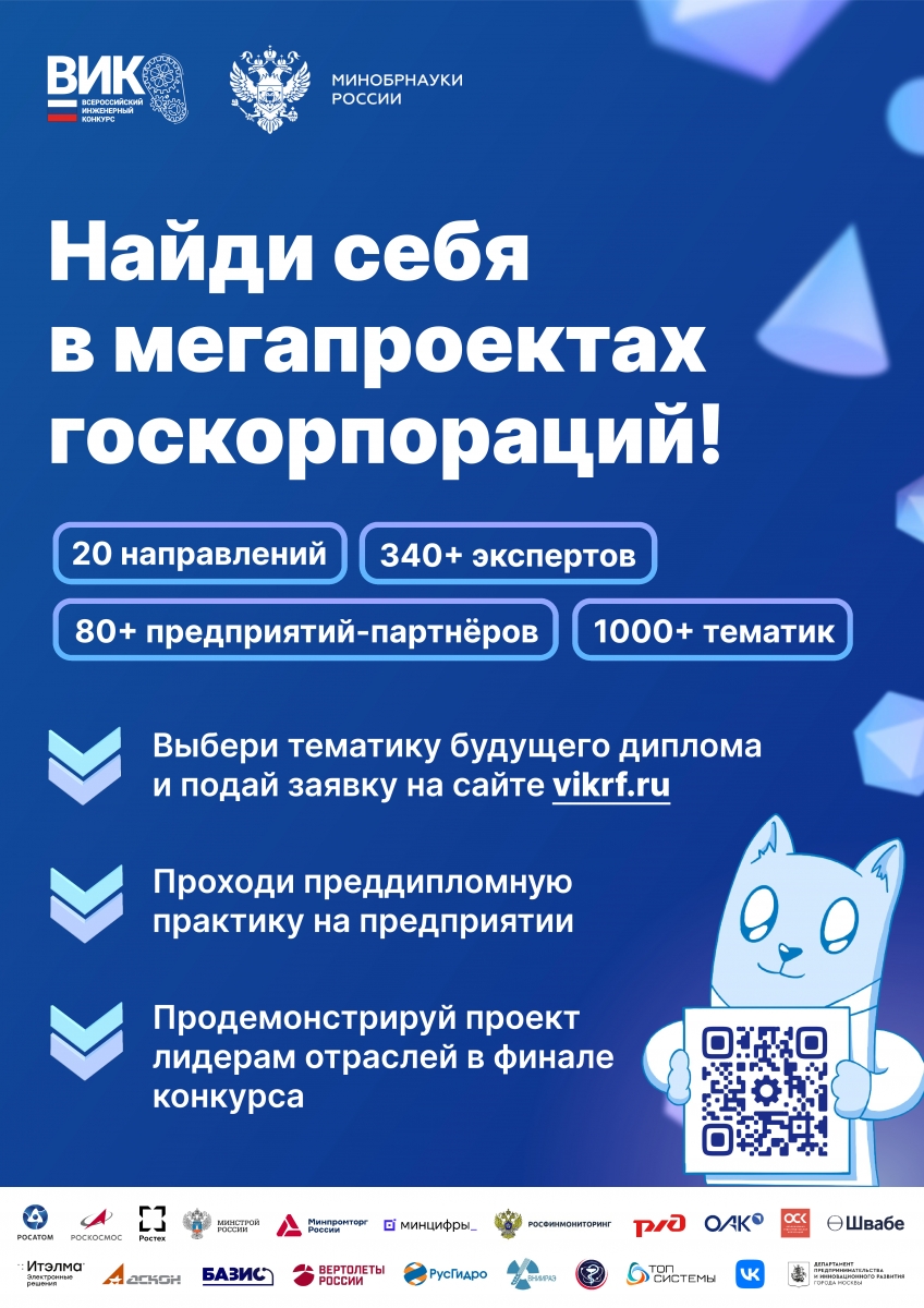 1 октября открыт прием заявок для студентов выпускных курсов и аспирантов на XII Всероссийский инженерный конкурс (ВИК). Конкурс проводится с 2014 года по поручению Президента России и является уникальной площадкой, где рождаются будущие лидеры технологического развития страны.