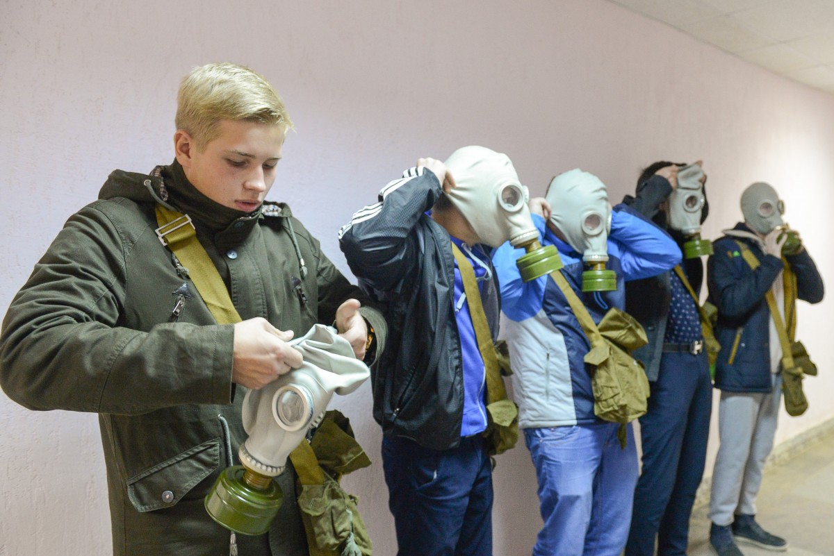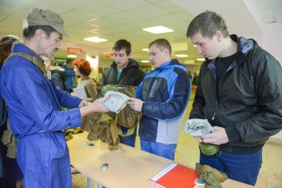 Собравшимся показали, как правильно складывать противогаз и носить сумку, рассказали о трех степенях готовности противогаза: «походной» - противогаз слева, «наготове» — противогаз спереди, и «боевой» - противогаз надет. «Берем маску так, чтобы четыре пальца были внутри, а большой снаружи, - объяснял инструктор Олег Ремский . - Затем надеваем с подбородка на затылочную часть, проверяем противогаз на герметичность». Было видно, что личный состав пункта выдачи СИЗ отлично знает свои функциональные обязанности и применяет их в действии. «Газы» — послышалось в коридоре, и все, как по команде, задержали дыхание, закрыли глаза и надели противогазы.