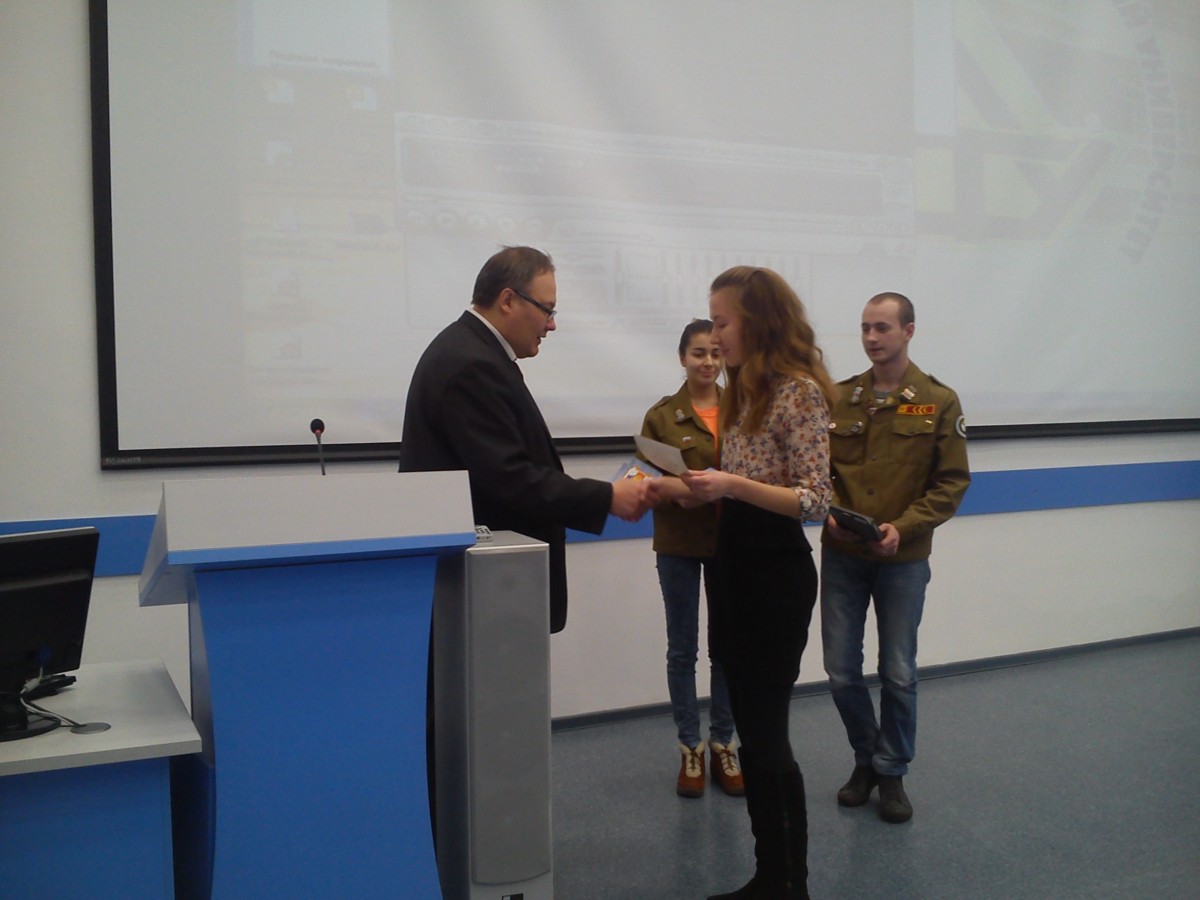 Дипломом первой степени награждена Яна Дерябина (Э-1-14), участница, призер и победитель целого ряда гуманитарных олимпиад и викторин. Второе место у Елены Золотухиной (Э-14). Диплом третьей степени получили студенты, приехавшие в Ухту из Сербии: Марко Милетич (гр. М-14) и Стефан Милованович (гр. ЭП-14).