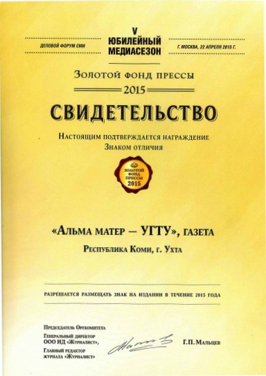 Газета Ухтинского государственного технического университета «Альма-матер» стала обладателем Знака отличия Делового форума «Золотой фонд прессы» 2015 года. Награда была присуждена на подведении итогов форума 22 апреля.