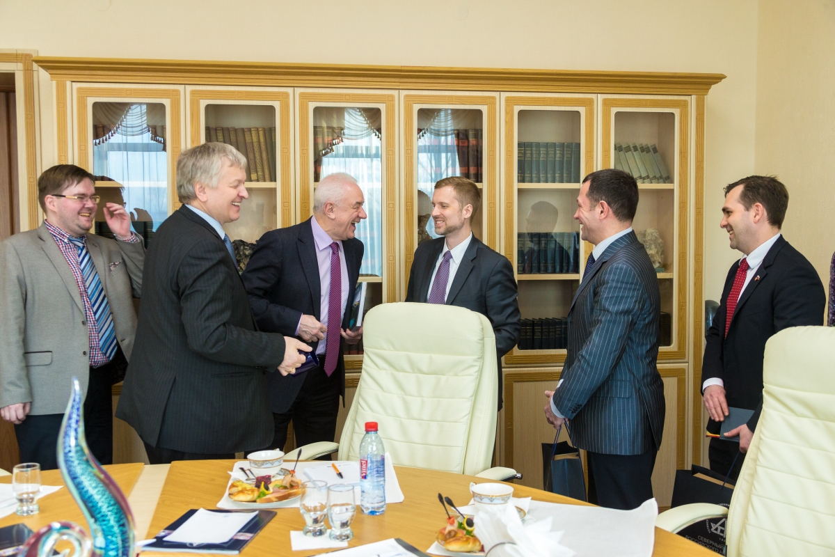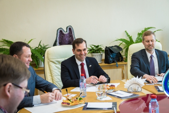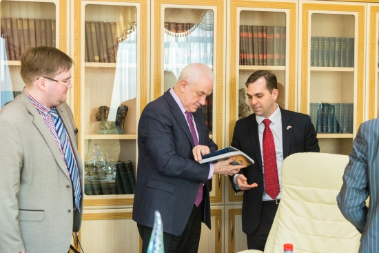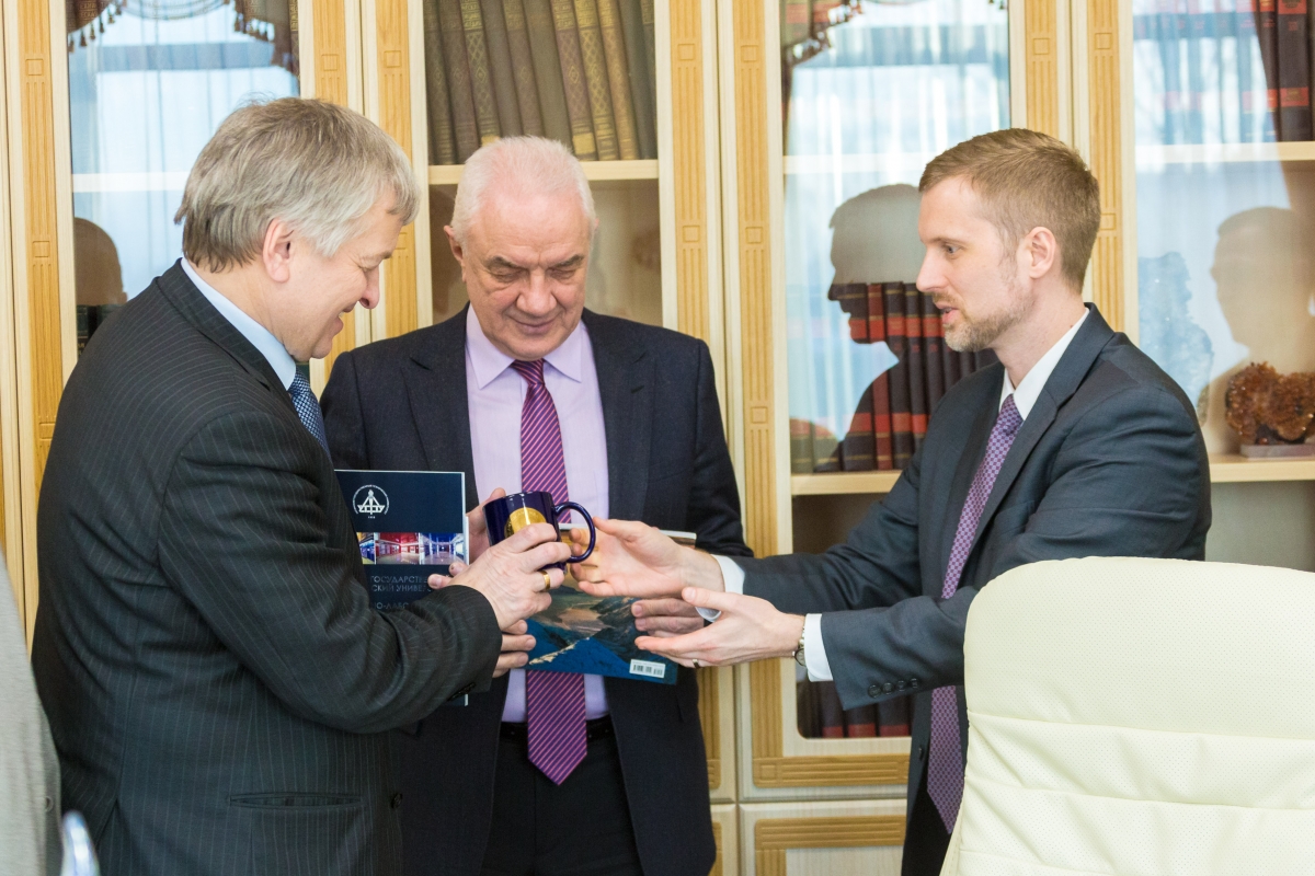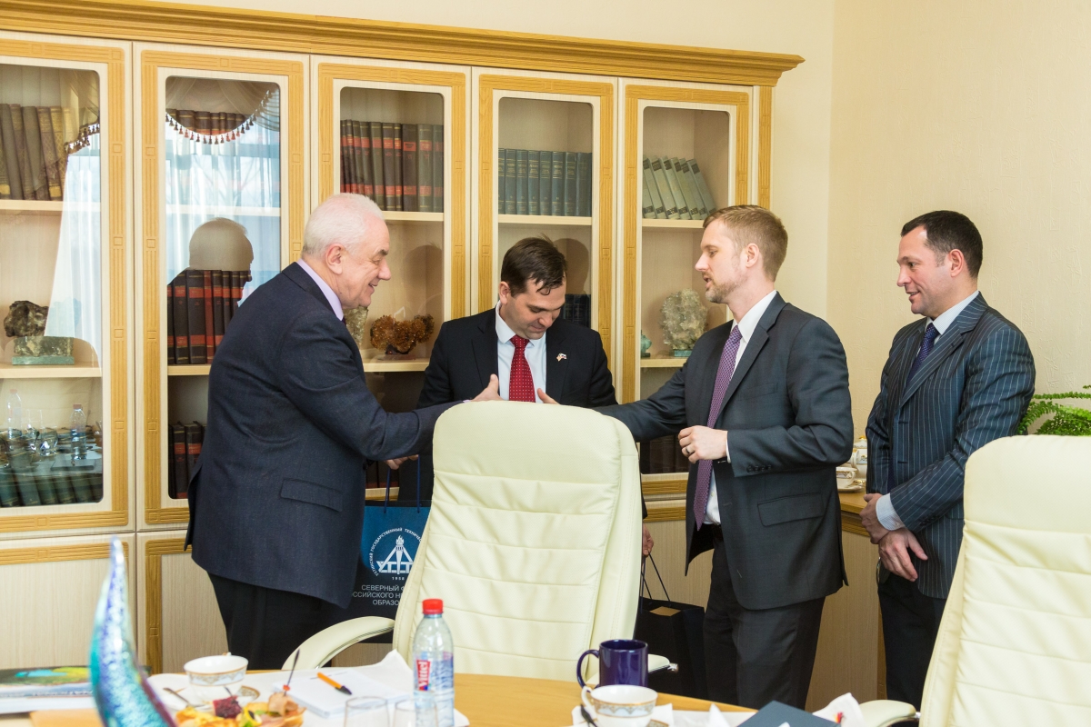 Рабочий визит в ухтинский вуз завершился деловой встречей с ректором университета, профессором Николаем Цхадая и заместителем Председателя Правительства Республики Коми – министром промышленности, природных ресурсов, энергетики и транспорта региона Николаем Герасимовым. В ходе встречи стороны обменялись мнениями и предложениями по перспективам взаимодействия в образовательной, научной, энергетической сферах, а также по вопросам спортивной дипломатии.