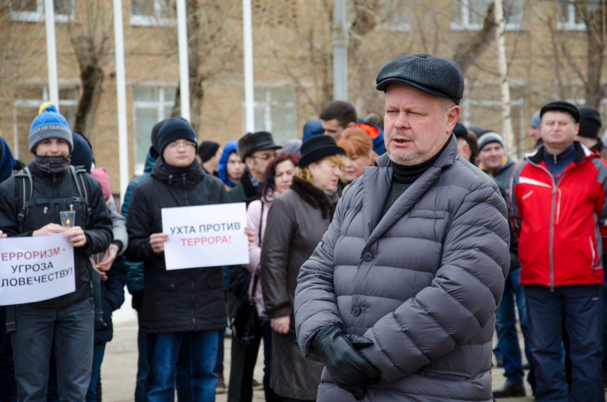 Митинг проходил на площади перед главным корпусом УГТУ. Почтить память погибших и выразить свой протест против террора вышли горожане и общественники разных возрастов. Депутат молодежного совета города Александра Зерюнова открыла мероприятие, объявив минуту молчания. Затем слово взяла председатель ухтинского городского Комитета защиты мира Антонина Каргалина: «Мы пришли сегодня сказать: «Нет террору!». Мы хотим выразить свои соболезнования всем тем, кто потерял родных и близких». Следующим стало выступление заместителя начальника управления по учебно-воспитательной работе и социальным вопросам УГТУ Евгения Вологина: «Россия с незапамятных времен была многонациональной и многорелигиозной страной. Я взял с собой две великие книги человечества. Это Библия и Коран. В этих книгах нет того, к чему призывают террористы. Это книги любви, это книги добра».