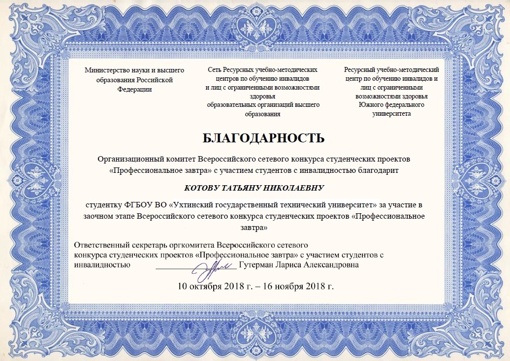 Организационный комитет Всероссийского сетевого конкурса поблагодарил Татьяну Котову за представленную работу и пригласил на очную защиту проекта. Очный этап пройдет в начале декабря 2018 года в Южном федеральном университете в г. Ростов-на-Дону.