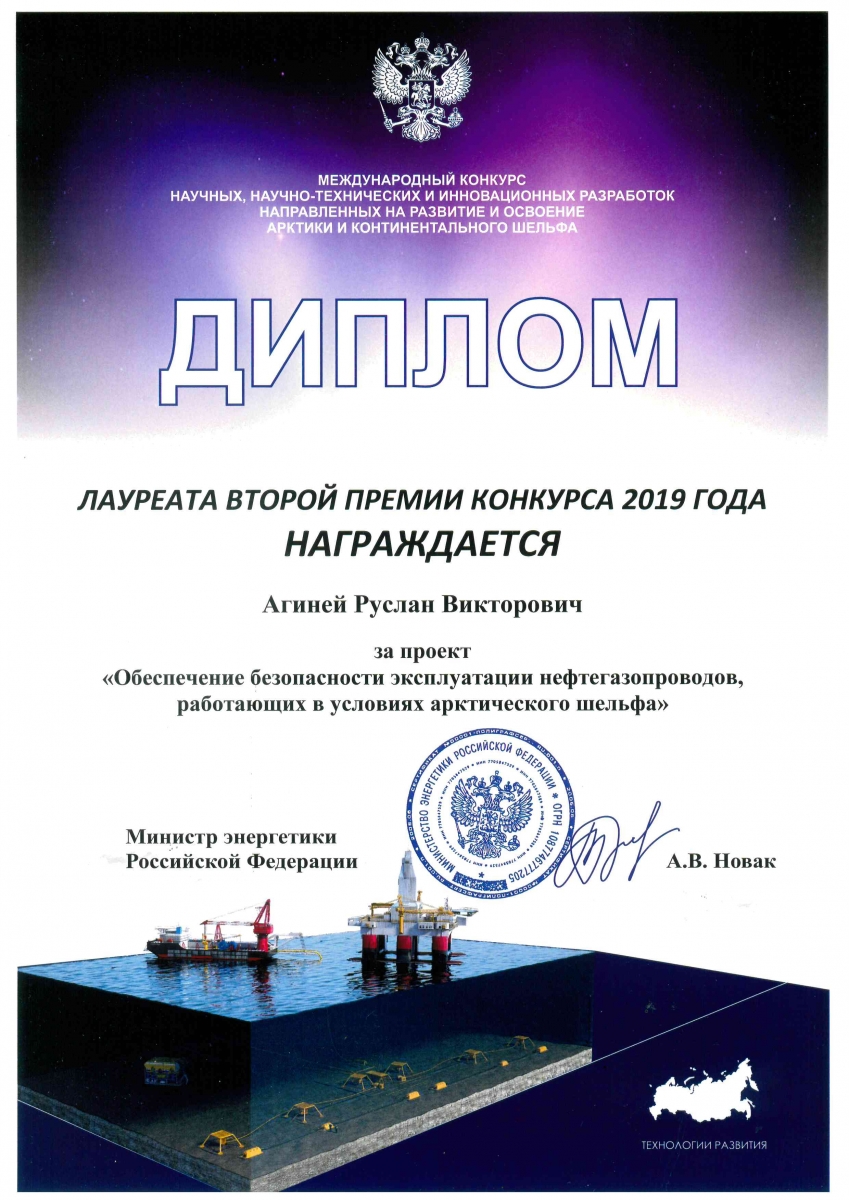 По итогам Международного конкурса научных, научно-технических и инновационных разработок, направленных на развитие и освоение Арктики и континентального шельфа в 2019 г. врио ректора УГТУ Р. В. Агиней удостоен второй премии за проект «Обеспечение безопасности эксплуатации нефтегазопроводов, работающих в условиях арктического шельфа», подготовленный совместным авторским коллективом Ухтинского университета и АО «Гипрогазцентр». Конкурс проходит пятый год подряд при поддержке Министерства энергетики и Правительства Российской Федерации.