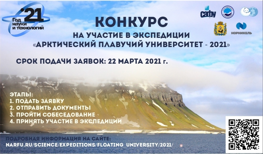 Найти подробную информацию о научно-исследовательской и образовательной программе экспедиции «АРКТИЧЕСКИЙ ПЛАВУЧИЙ УНИВЕРСИТЕТ — 2021» и подать заявку на участие можно на сайте https://narfu.ru/science/expeditions/floating_university/2021/