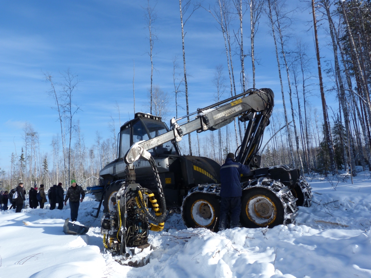 Все наблюдения сопровождались интересными и полезными комментариями Владимира Кринке. Так, мы узнали, что «железные дровосеки» появились на предприятии в далеком 2011 году, примерная их стоимость на тот момент составляла 18 млн рублей. Производительность эти гиганты показывают внушительную – на пару эти машины заготавливают около 200 кубометров  древесины в смену, которая длится 12 часов. Вахта длится 20 дней, после нее рабочие отдыхают десять дней.