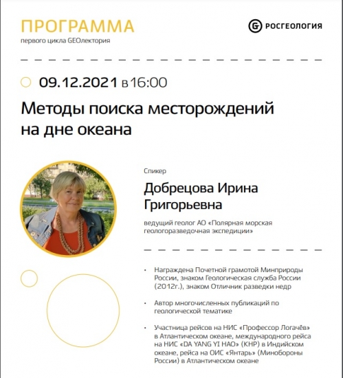 Лектор - Добрецова Ирина, ведущий геолог АО «Полярная морская геологоразведочная экспедиция».