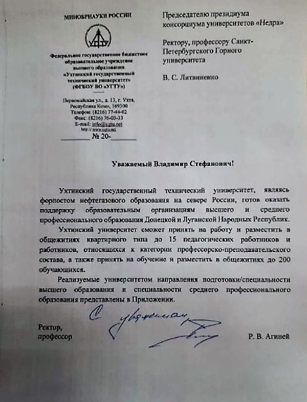 Ухтинский государственный технический университет поддержал инициативу консорциума вузов Северо-Запада России "Недра" по оказанию поддержки образовательным организациям высшего и среднего профессионального образования Донецкой и Луганской народных республик. "Ухтинский университет сможет принять на работу и разместить в общежитиях квартирного типа до 15 педагогических работников и работников, относящихся к категории профессорско-преподавательского состава, а также принять на обучение и разместить в общежитиях до 200 обучающихся", - сообщил ректор УГТУ, профессор Руслан Агиней в письме председателю президиума консорциума университетов «Недра» Владимиру Литвиненко.