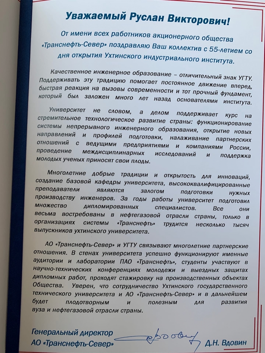 "Уверен, что сотрудничество Ухтинского государственного технического университета и АО "Транснефть-Север" и в дальнейшем будет плодотворным и полезным для развития вуза и нефтегазовой отрасли", - подчеркнул генеральный директор АО "Транснефть-Север" Денис Николаевич Вдовин в поздравлении вуза с 55-летием.