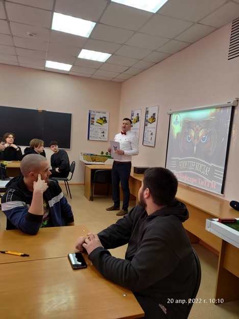 В рамках недели технологического факультета в среду, 20 апреля, на кафедре технологии и транспортно-технологических машин прошла интеллектуальная игра «Что? Где? Когда?» между командами УГТУ и Индустриального техникума Индустриального института (СПО) УГТУ. Игра проводится уже второй год, и такой формат интеллектуальных поединков становится все более популярным.