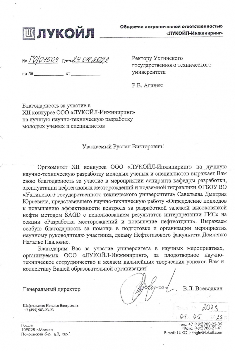 Оргкомитет XII конкурса ООО «ЛУКОЙЛ-Инжиниринг» на лучшую научно-техническую разработку молодых ученых и специалистов выразил благодарность за участие в мероприятии аспиранта кафедры разработки, эксплуатации нефтегазовых месторождений и подземной гидравлики УГТУ Дмитрия Савельева.