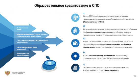 Между Министерством просвещения РФ и ПАО «Сбербанк России» подписано соглашение о предоставлении субсидии на государственную поддержку образовательного кредитования. В соответствии с соглашением Сбербанк предоставляет образовательные кредиты гражданам, поступившим в организации, осуществляющие деятельность по программам среднего профессионального образования (СПО).