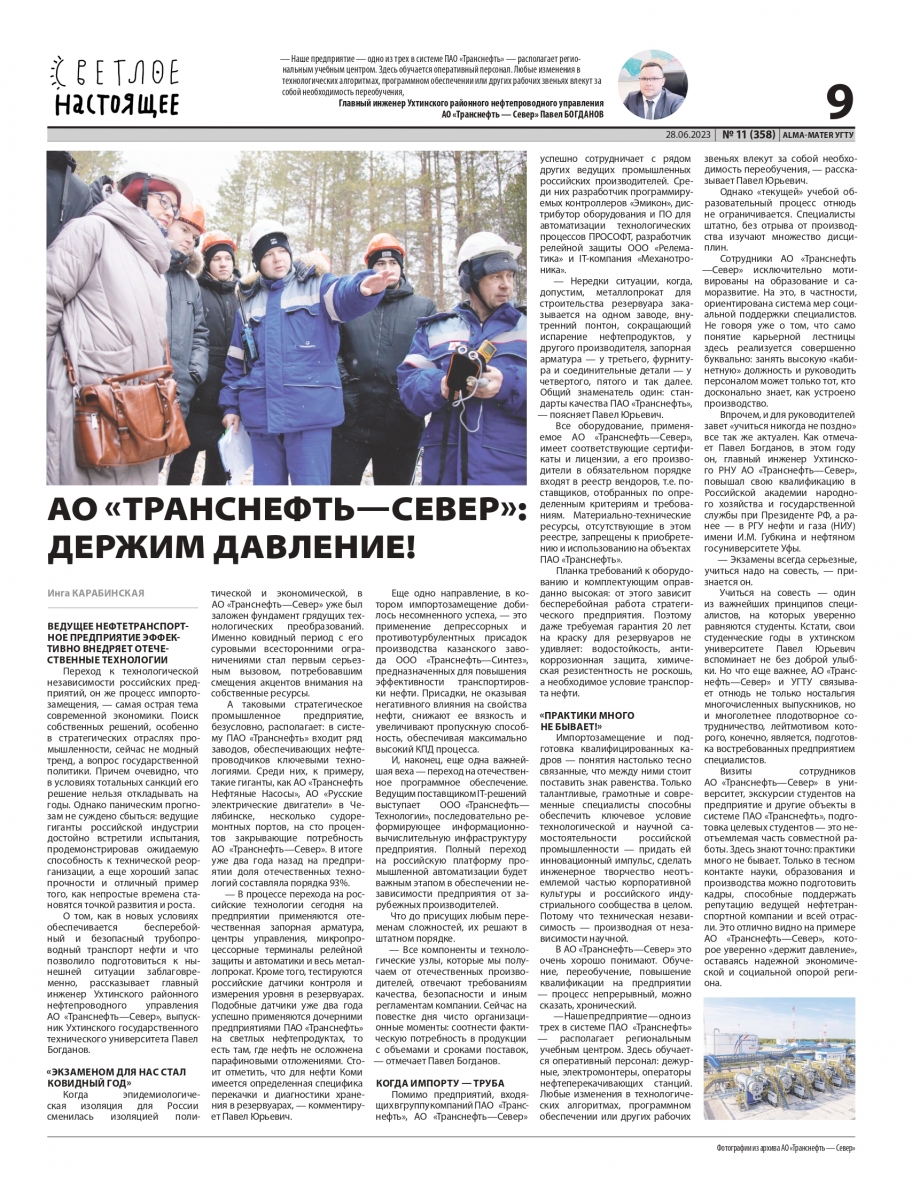 В материале «АО “Транснефть - Север”: держим давление!», опубликованном в газете Ухтинского университета «Альма-матер», автор подробно раскрывает тему внедрения на предприятии отечественных технологий. Ключевым экспертом по данному вопросу выступил выпускник УГТУ инженер Ухтинского районного нефтепроводного управления Павел Богданов. Он провел большую подготовительную работу по сбору данных и обо всех производственных нюансах рассказал доступным языком, за что автор ему очень благодарна.