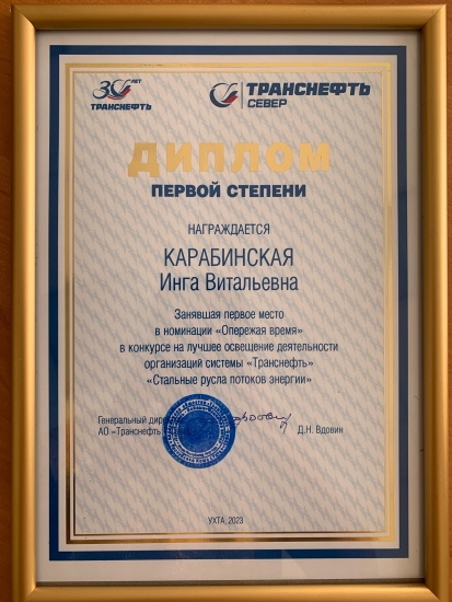 Шеф-редактор отдела стратегических коммуникаций УГТУ Инга Карабинская стала победителем конкурса журналистского мастерства «Стальные русла потоков энергии», приуроченного к 30-летию ПАО «Транснефть», в номинации «Сохранить и приумножить». Торжественная церемония награждения состоялась сегодня в АО «Транснефть - Север».