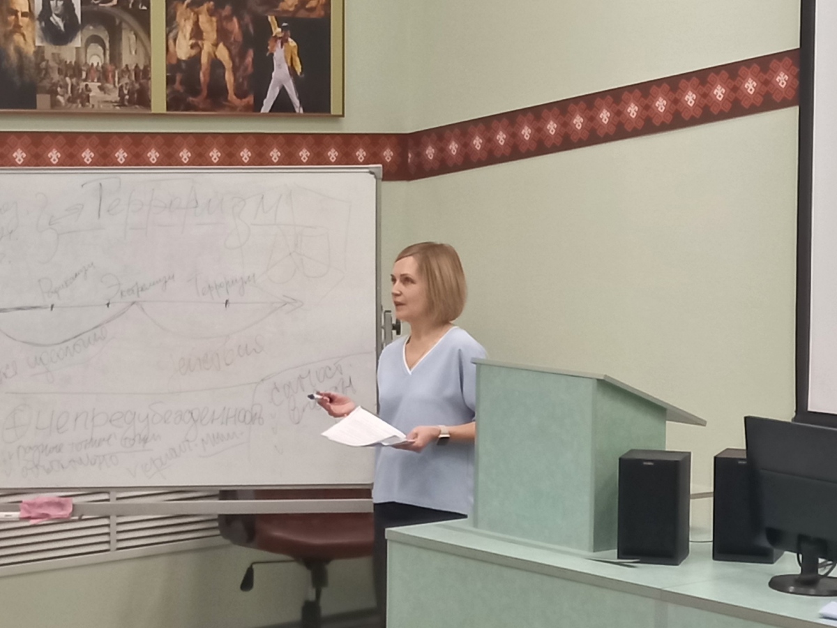 Педагог-психолог объяснила студентам понятие «терроризм», риски возникновения экстремистских тенденций в молодежной среде.