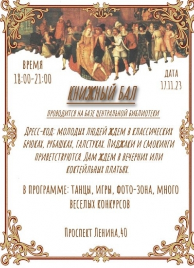 С 18.00 до 21.00 в центральной библиотеке Ухты (ул. Ленина, 40) состоится праздничный «Книжный бал». В программе танцы, игры, фотозона и веселые конкурсы.