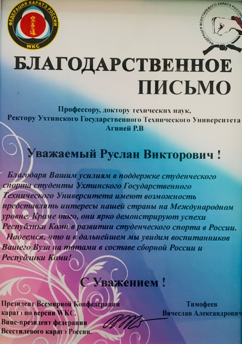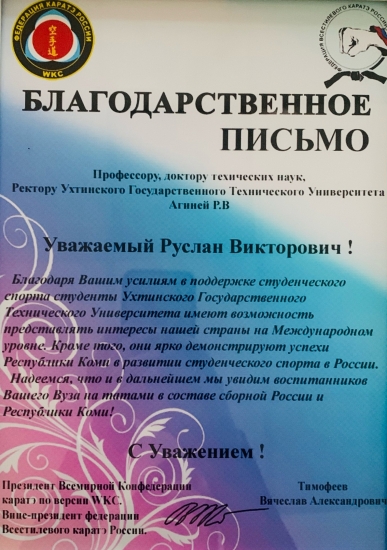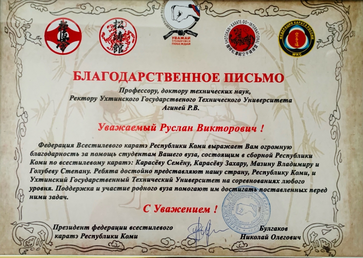 29 ноября, в ходе Ученого совета, ректору Ухтинского университета, профессору Руслану Агиней были вручены благодарственные письма от президента федерации каратэ WKC Республики Коми, Чемпиона Мира, КМС Николая Милушкина и официального представителя Всестилевого каратэ России в Республике Коми , тренера высшей категории Михаила Корзухина.