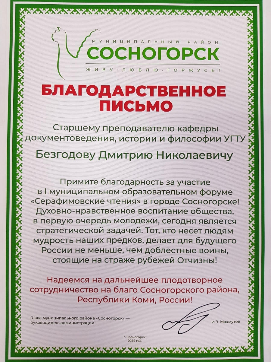 В благодарственном письме главы – руководителя администрации МР «Сосногорск» И. З. Махмутова, врученном Дмитрию Николаевичу, отмечается стратегическое значение духовно-нравственного просвещения и воспитания для современного российского общества.