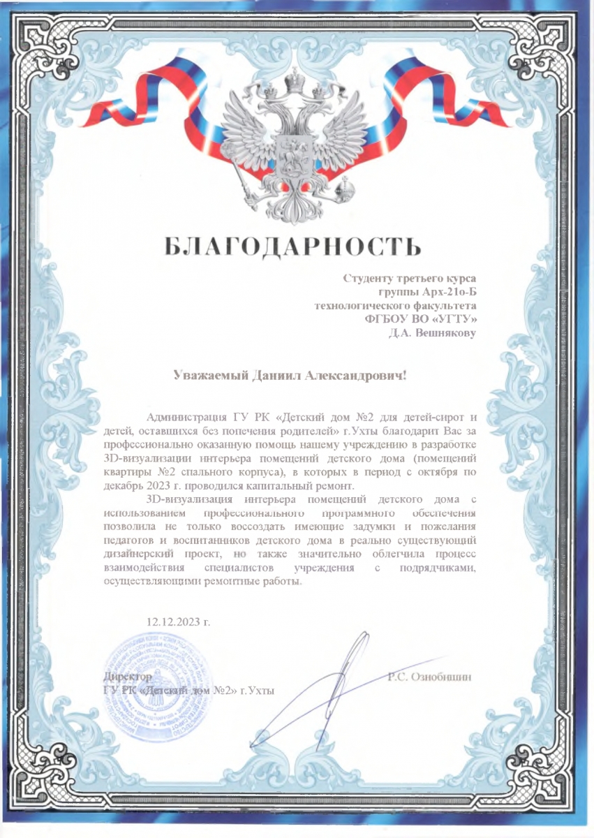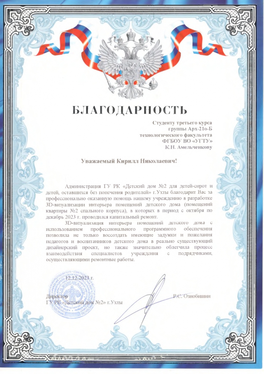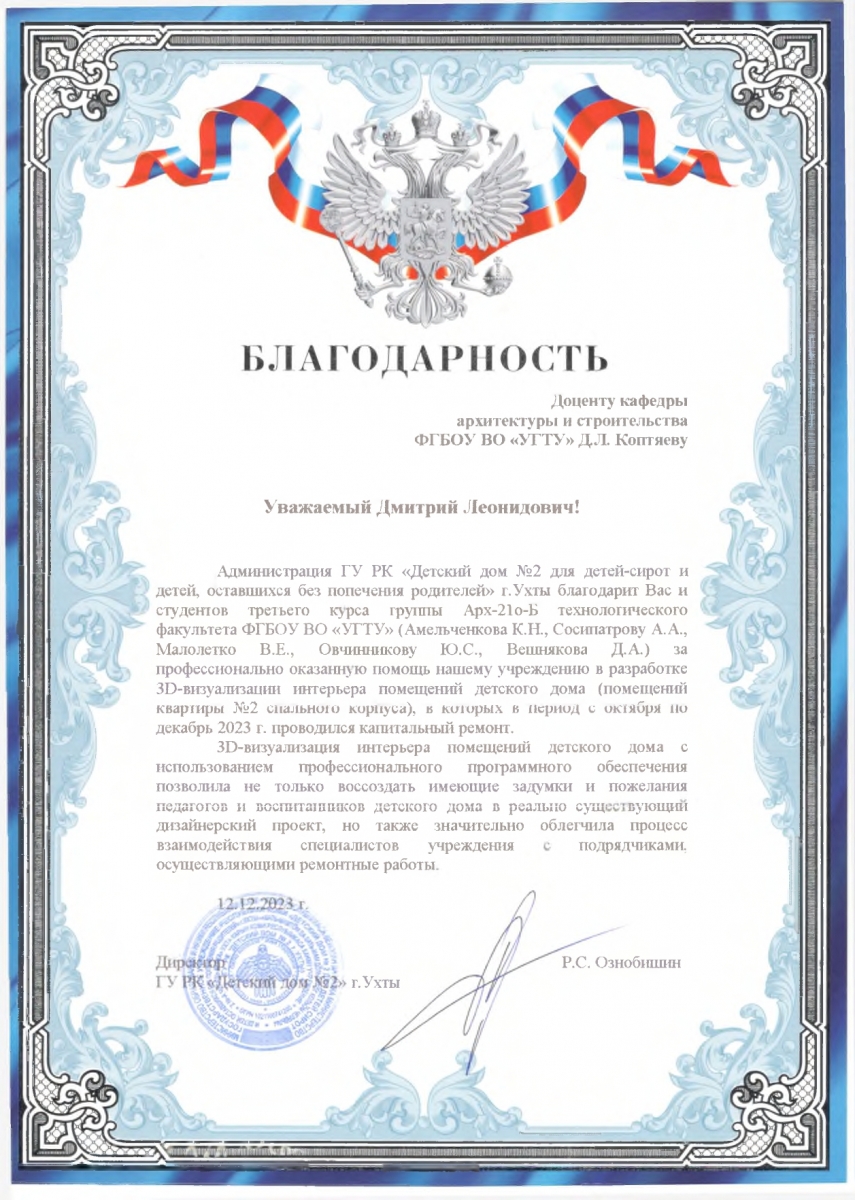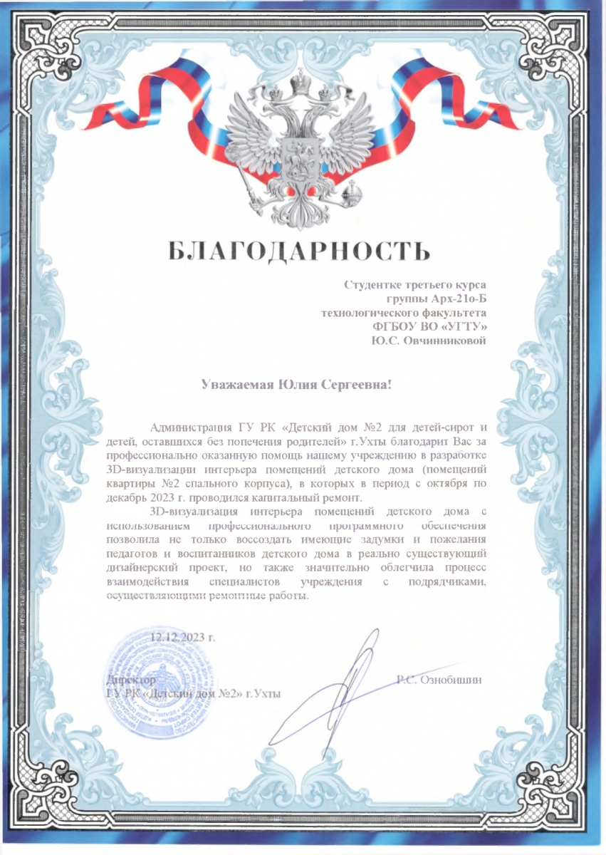 Администрация ГУ РК «Детский дом № 2 для детей-сирот и детей, оставшихся без попечения родителей» направила благодарности студентам технологического факультета Кириллу Амельченкову, Алене Сосипатровой, Валерии Малолетко, Юлии Овчинниковой, Даниилу Вешнякову и их руководителю доценту кафедры архитектуры и строительства Дмитрию Коптяеву. Творческий коллектив УГТУ помог визуализировать интерьер помещений детского дома, в которых проводился капитальный ремонт.