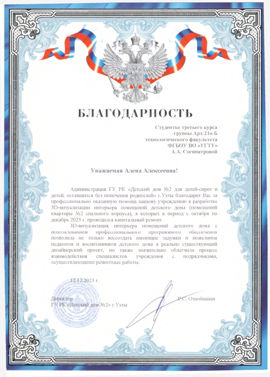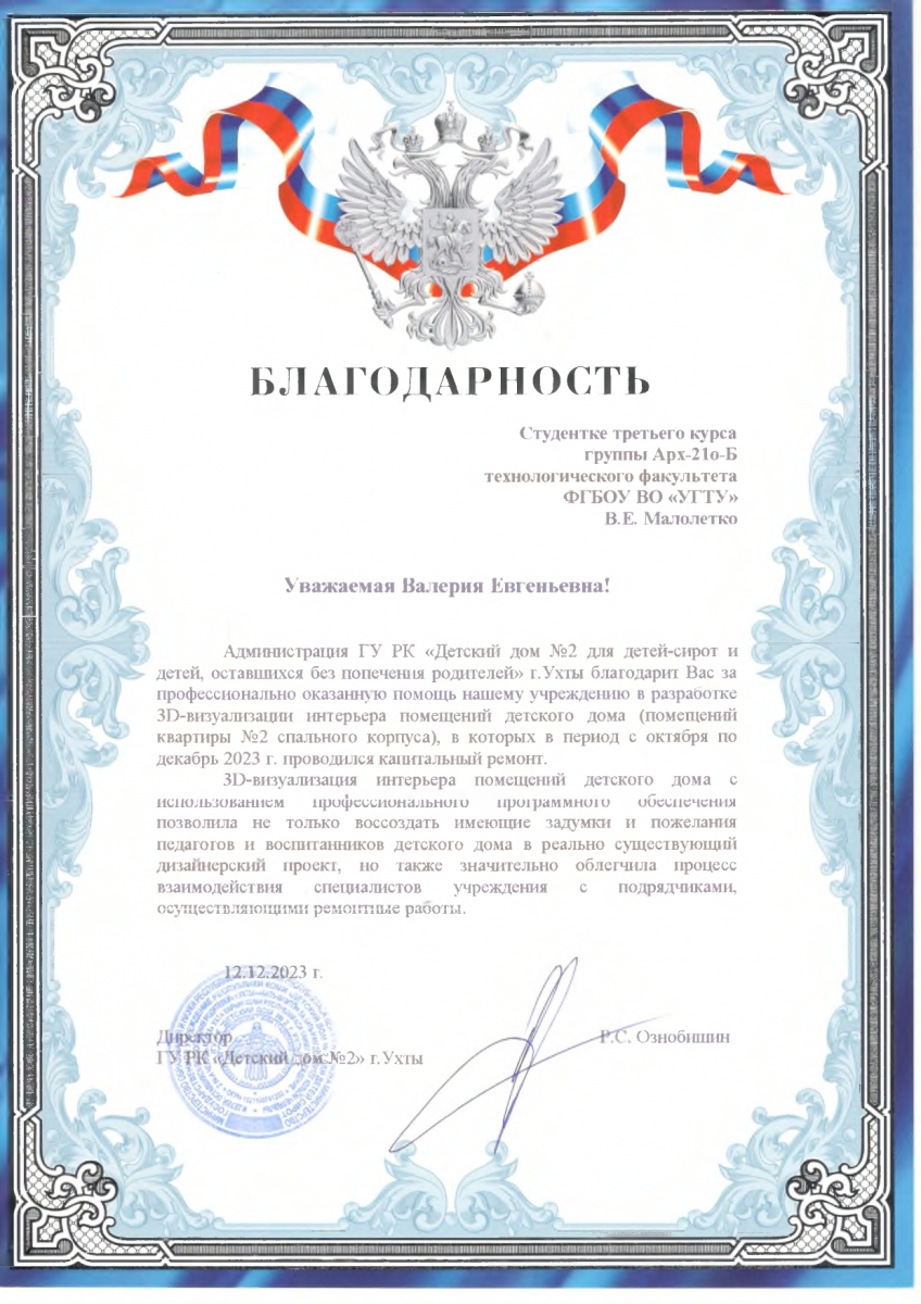 «Визуализация интерьера помещений детского дома с использованием профессионального программного обеспечения позволила не только воссоздать задумки и пожелания педагогов и воспитанников детского дома в реально существующий дизайнерский проект, но также значительно облегчила процесс взаимодействия специалистов учреждения с подрядчиками, осуществляющими ремонтные работы», - отметил в благодарственном письме директор ГУ РК «Детский дом № 2 для детей-сирот и детей, оставшихся без попечения родителей» Роман Ознобишин.