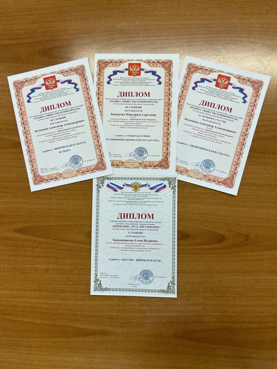 Студенты и сотрудники Воркутинского филиала УГТУ отмечены дипломами международного конкурса научных, методических и творческих работ «Родина: общество и приоритеты».