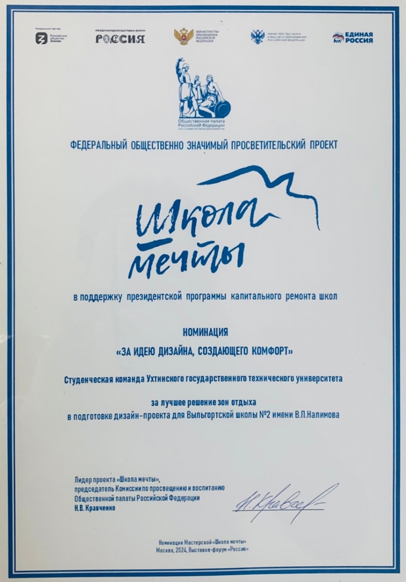 В середины декабря 2023 года Ухтинский университет присоединился к общественно-просветительскому проекту «Школа мечты», реализуемому в рамках федеральной программы капитального ремонта школ «Модернизация школьных систем образования». Творческая команда из девяти студентов кафедры архитектуры УГТУ и курирующие их наставники подготовили дизайн-проект модернизации Выльгортской средней общеобразовательной школы №2, в котором воплотили свое видение современных пространств для учебы, развития и отдыха.   Итогом работы творческой команды стала презентация и защита проекта перед Главой Республики Коми Владимиром Уйба и представителями профильных ведомств региона.