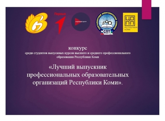 Конкурс Лучший выпускник профессиональных образовательных организаций Республики Коми» призван содействовать личностному развитию, а также процессам трудовой социальной адаптации выпускников СПО и ВО, а также способствовать построению эффективной карьеры.