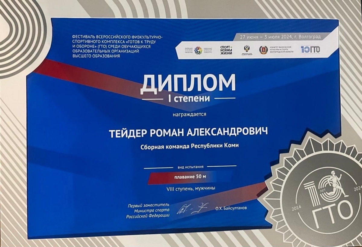 Студент Ухтинского университета Роман Тейдер стал абсолютным победителем в нормативе по плаванию на дистанцию 50 метров вольным стилем на V Фестивале ВФСК «ГТО» в Волгограде.