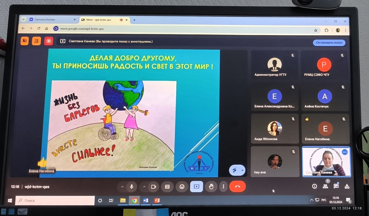 3 декабря 2024 года на платформе УГТУ прошел онлайн-телемост с участием вузов на тему: «Духовно-нравственное просвещение понимания инвалидности, основанное на принципах инклюзивной культуры в обществе». Мероприятие было приурочено к Международному дню инвалидов. Оно включено в программу XVI Международной объединённой научно-практической конференции «Специальное и инклюзивное образование: вызовы, проблемы, пути решения», проводимой в сотрудничестве с РУМЦ СЗФО ЧГУ. Формат онлайн-телемоста позволил охватить широкую аудиторию, включая студентов, преподавателей и всех заинтересованных лиц, без необходимости прерывать учебный процесс.
